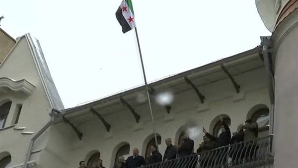 رفع العلم السوري الجديد على السفارة السورية بموسكو