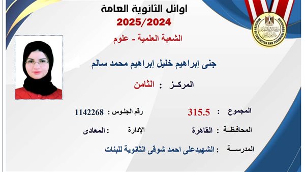 أوائل الثانوية العامة 2025.. جنى إبراهيم الثامنة علمى علوم: مش مصدقة نفسي وأحلم بالطب