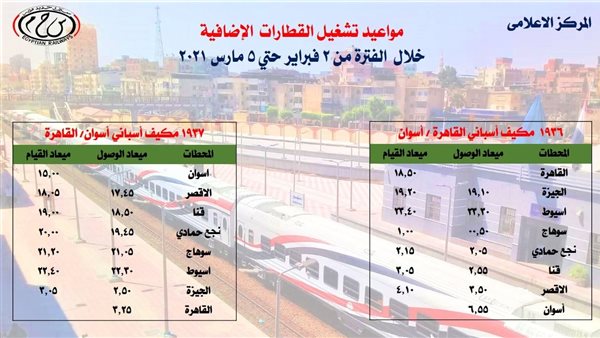 «السكة الحديد»: تشغيل قطارات وعربات إضافية بين القاهرة والإسكندرية وأسوان