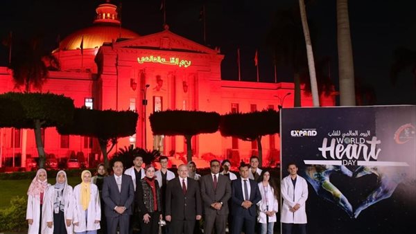 إضاءة قبة جامعة القاهرة باللون الأحمر احتفالا باليوم العالمي للقلب.. صور