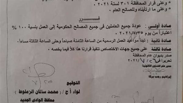 محافظ الوادي الجديد يقرر عودة العمل بالمصالح بكامل طاقتها أول أغسطس