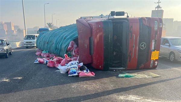 انقلاب سيارة نقل محملة «فول» على الطريق الدائري