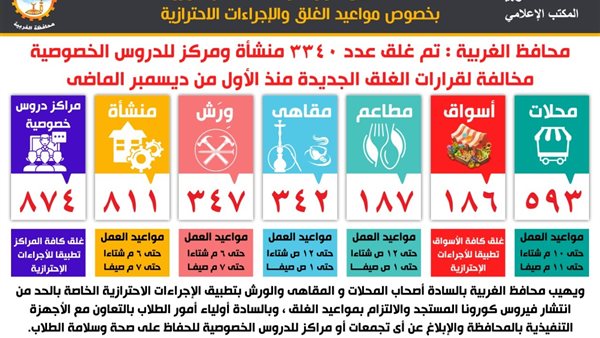 محافظ الغربية: غلق 1034 منشأة مخالفة لمواعيد الغلق و102 مركز للدروس الخصوصية
