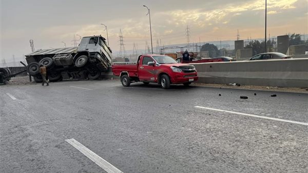 تصادم سيارتين وانقلاب إحداهما أعلى الطريق الدائري الأوسطي