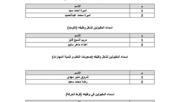 إعلان أسماء المقبولين للعمل بمركز تأهيل ذوي الاحتياجات الخاصة بالوادي الجديد