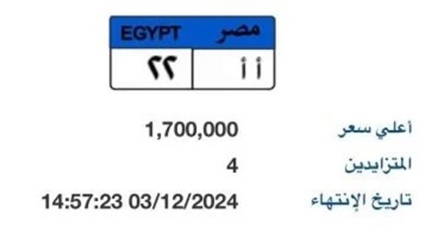 طرح لوحة سيارة «أ أ - 22» المميزة بالمزاد وسعرها يصل لـ 1.7 مليون جنيه