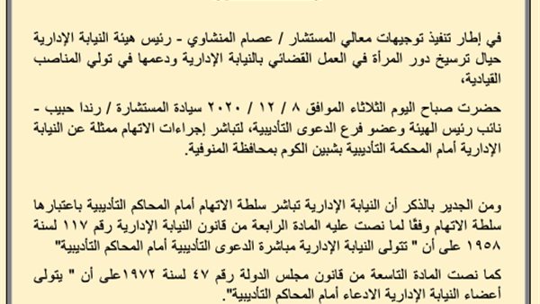 لأول مرة.. النيابة الإدارية تكلف مستشارة بمباشرة سلطة الإدعاء أمام المحاكم التأديبية