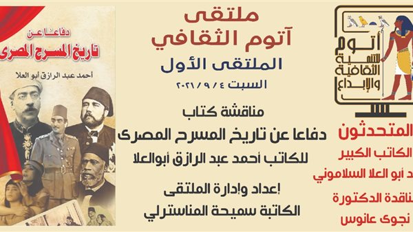 السبت.. مناقشة تاريخ المسرح المصري فى "ملتقى آتوم الثقافى" الأول