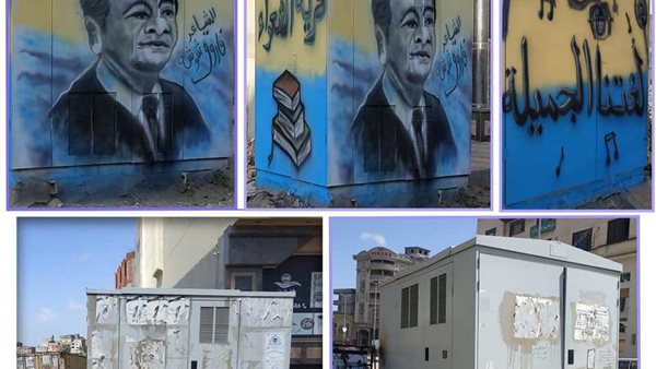 بصور فاروق شوشة.. تزيين أكشاك الكهرباء بمسقط رأسه في دمياط