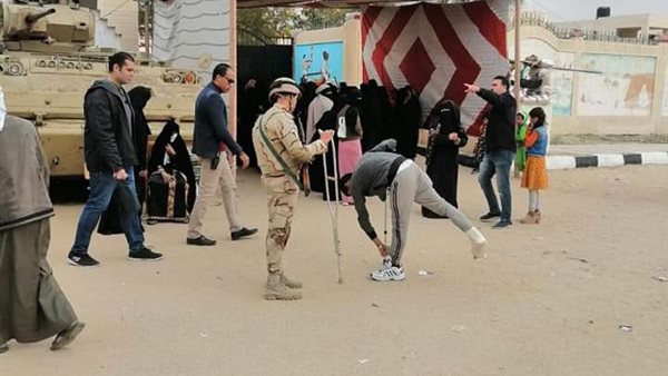 صورة بألف كلمة.. جندي بشمال سيناء يمسك العكاز لشاب من ذوي الاحتياجات الخاصة حتى يربط حذاءه