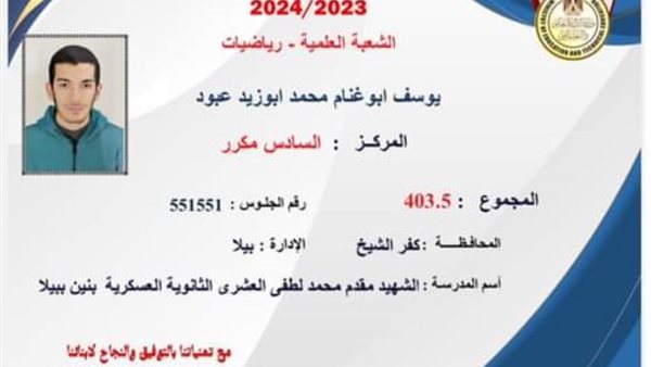 محافظ كفر الشيخ يهنئ الطالب يوسف أبو غنام السادس مكرر جمهورية على الثانوية العامة