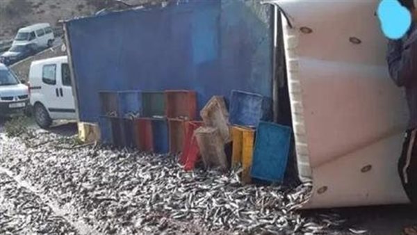 حمولة أسماك تنتشر على الطريق بعد انقلاب مفاجئ بالسويس