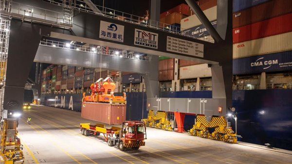 بالصور| لحظة وصول سفينة عملاقة تحمل 10 آلاف حاوية لرصيف «تحيا مصر»