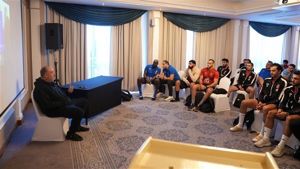 محمد الغزاوي يجتمع مع لاعبي الأهلي قبل نهائي السوبر المصري لليد بالإمارات