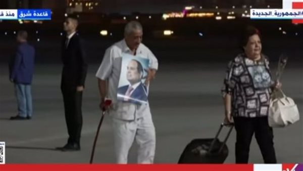 عائد من السودان يحتضن صورة الرئيس السيسي لدى وصوله القاهرة