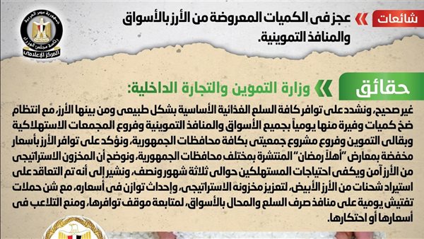«الحكومة» تنفي وجود عجز في الكميات المعروضة من الأرز بالأسواق ومنافذ التموين