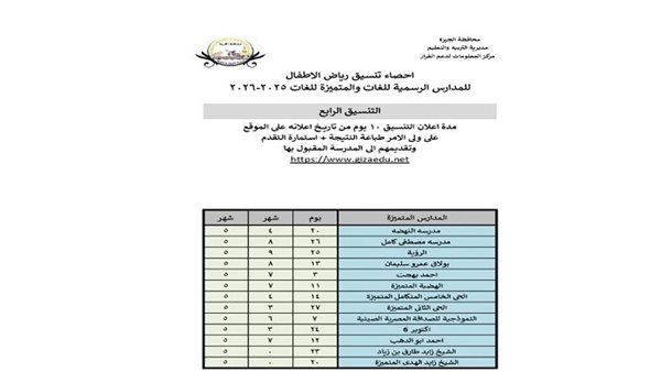 تعليم الجيزة يعلن التنسيق الرابع لنتيجة الصف الأول برياض الأطفال للعام الدراسي 2025 / 2026