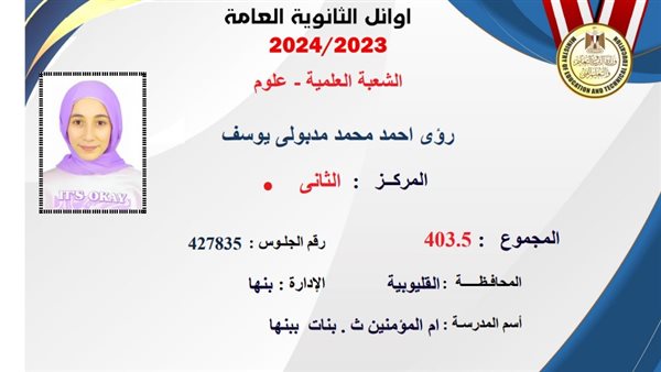نتيجة الثانوية العامة: رؤى أحمد مدبولي تحصل على المركز الثاني علمي علوم بـ403.5 درجة