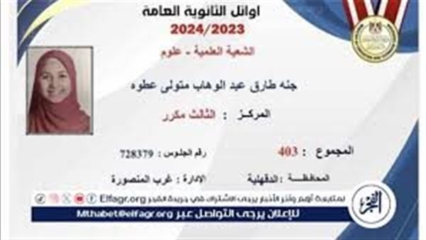 محافظ الدقهلية يهنئ الثالثة مكرر في الثانوية العامة علمي علوم