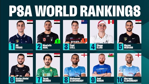 تصنيف الإسكواش.. علي فرج يحافظ على الصدارة ومصطفى عسل يتقدم للوصافة