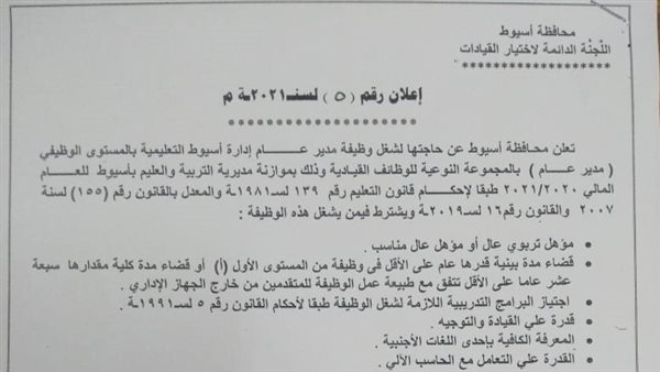 محافظة أسيوط تعلن عن حاجتها لشغل وظائف قيادية بمديرية التعليم